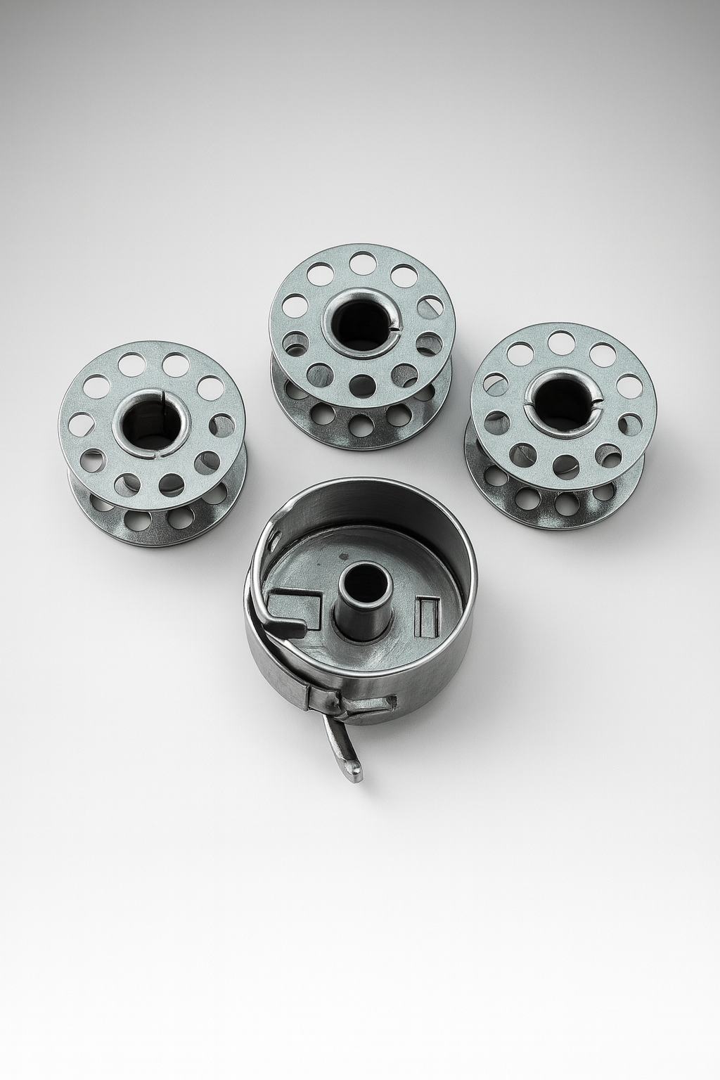 Set of 4 Metal Sewing Machine Bobbins with Bobbin Case